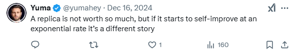 “复制品并不值那么多钱,但如果它开始以指数级的速度自我改进,那就另当别论了。”